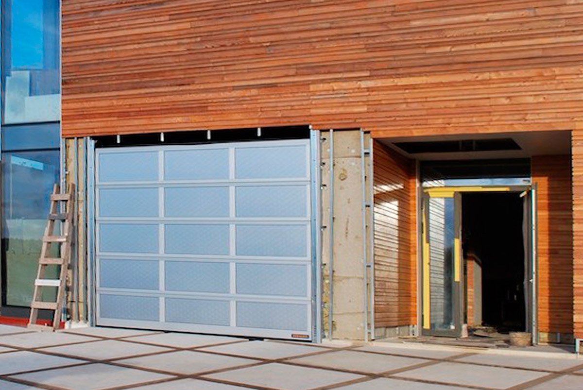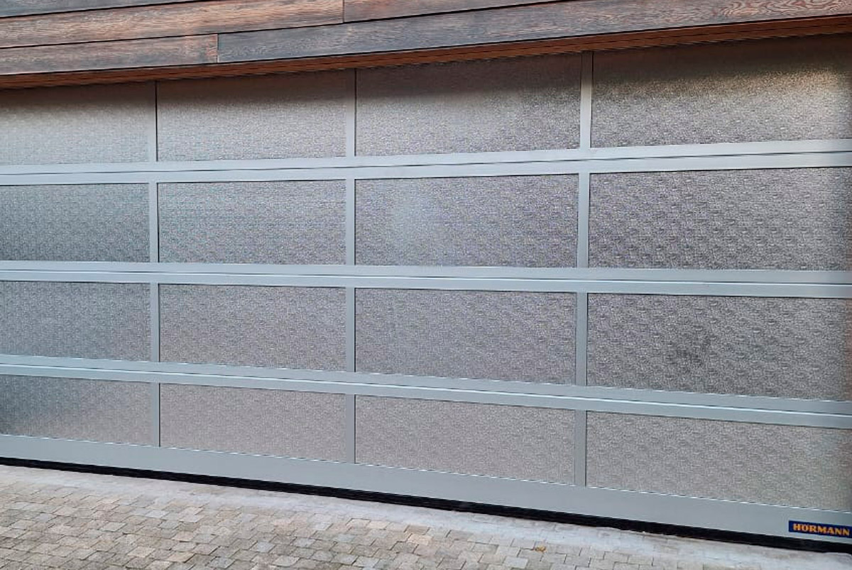 Доставка и монтаж секционных остеклённых ворот из алюминия Hormann ALR F42 под индивидуальную обшивку. Размер ШхВ 6100 х 2320 мм. Полотно ворот из остеклённой рамы: анодированный алюминиевый прессованный профиль с защитой от защемления пальцев снаружи и изнутри, со стальными боковыми заглушками. Напольное уплотнение, промежуточные уплотнения и уплотнение перемычки из EPDM.